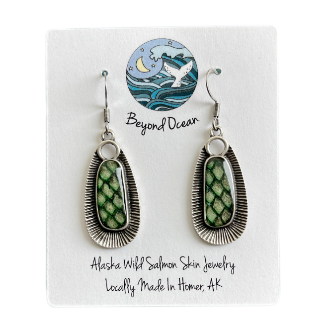 Each piece is handcrafted with love for ocean folks by Beyond Ocean in Homer, Alaska. Wild-caught Alaskan salmon skin is tanned, dyed, and coated with epoxy for a waterproof seal. Due to the nature of the material, each has a unique scale pattern and color, making them a one-of-a-kind piece. Caught by owner Morgan Edminster and her female crew aboard the gill netter F/V Holly Ann, the skin is a byproduct of sustainably-fished salmon and otherwise would be discarded.